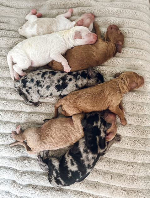 Puppies go home at 8 weeks old after a thorough vet check, deworming, and with their first round of vaccinations. All of our puppies come with a two year congenital health guarantee. They also go home microchipped with a fun puppy pack, a custom made puppy guide, & a personalized bandana! You will get access to our "The W Doods Fam" Facebook group and lifetime breeder support!